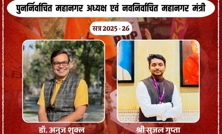- डॉ. अनुज शुक्ला को रायपुर महानगर का अध्यक्ष चुना गया। डॉ. शुक्ला, जो वर्तमान में नेशनल इंस्टीट्यूट ऑफ टेक्नोलॉजी में असिस्टेंट प्रोफेसर के रूप में कार्यरत हैं, विद्यार्थी परिषद के समर्पित कार्यकर्ता रहे हैं। वे राष्ट्रीय कार्यकारिणी सदस्य और कैंपस अध्यक्ष के रूप में भी अपनी सेवाएँ दे चुके हैं।