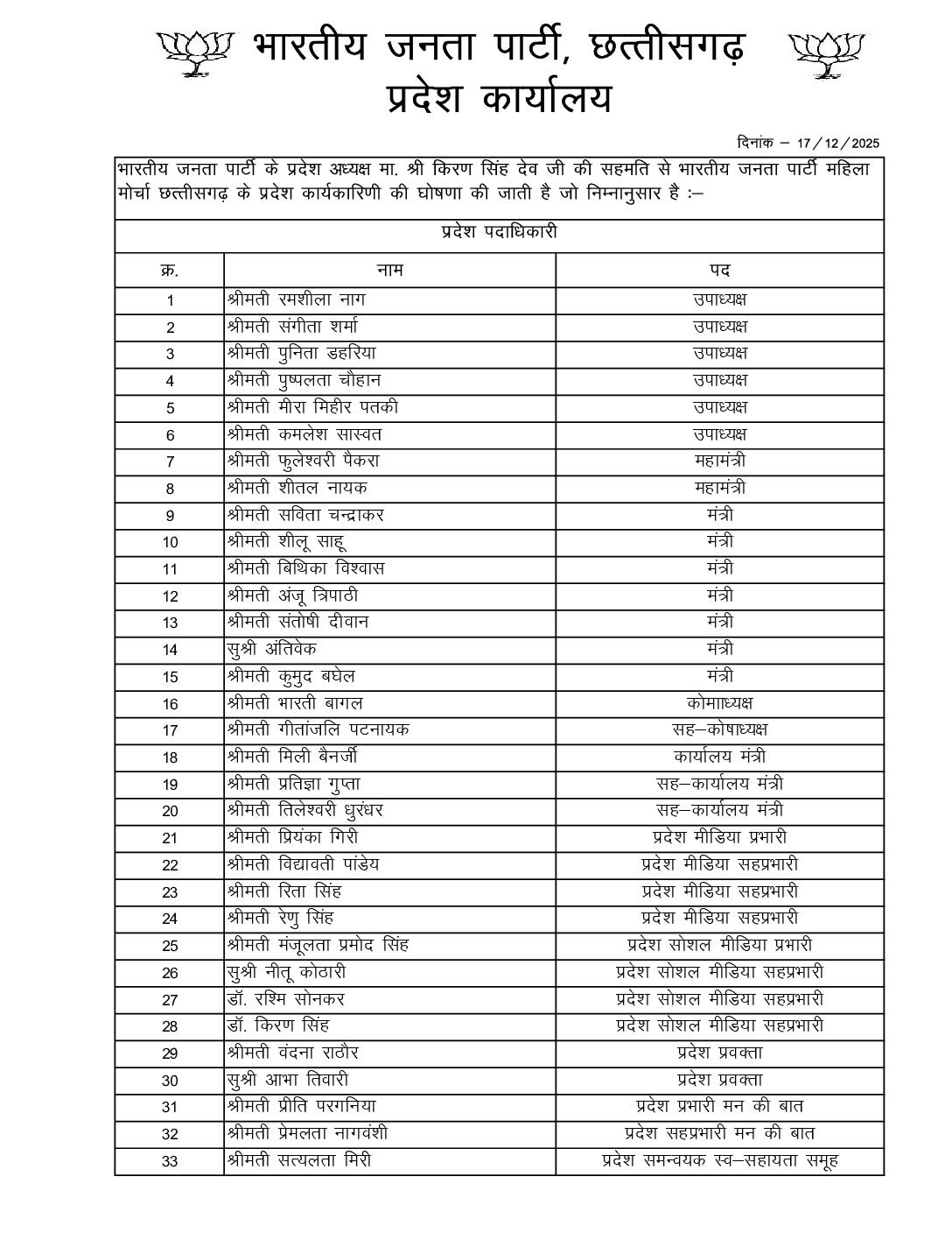रायपुर। भारतीय जनता पार्टी के प्रदेश अध्यक्ष किरण सिंहदेव की सहमति से भारतीय जनता पार्टी महिला मोर्चा छत्तीसगढ़ के प्रदेश कार्यकारिणी की घोषणा कर दी गई है। जिसमें 6 उपाध्यक्ष, दो महामंत्री, 7 महामंत्री बनाए गए है।