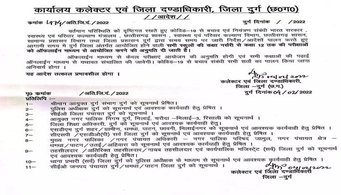 दुर्ग। दुर्ग कलेक्टर डॉ. सर्वेश्वर नरेंद्र भुरे की ओर से जारी आदेश में कहा गया है कि वर्तमान परिस्थिति को दृष्टिगत रखते हुए कोविड-19 से बचाव एवं नियंत्रण संबंधी भारत सरकार, स्वास्थ्य एवं परिवार कल्याण मंत्रालय छत्तीसगढ़ शासन स्वास्थ्य एवं परिवार कल्याण विभाग, छत्तीसगढ़ शासन, सामान्य प्रशासन विभाग तथा जिला प्रशासन दुर्ग द्वारा समय समय पर जारी निर्देश / आदेशों पालन करते हुए आगामी समय मे दुर्ग जिला अंतर्गत आयोजित होने वाली सभी स्कूलों की कक्षा नर्सरी से कक्षा 12 तक की परीक्षाओं को ऑफलाईन माध्यम से आयोजित करने की अनुमति दी जाती है।