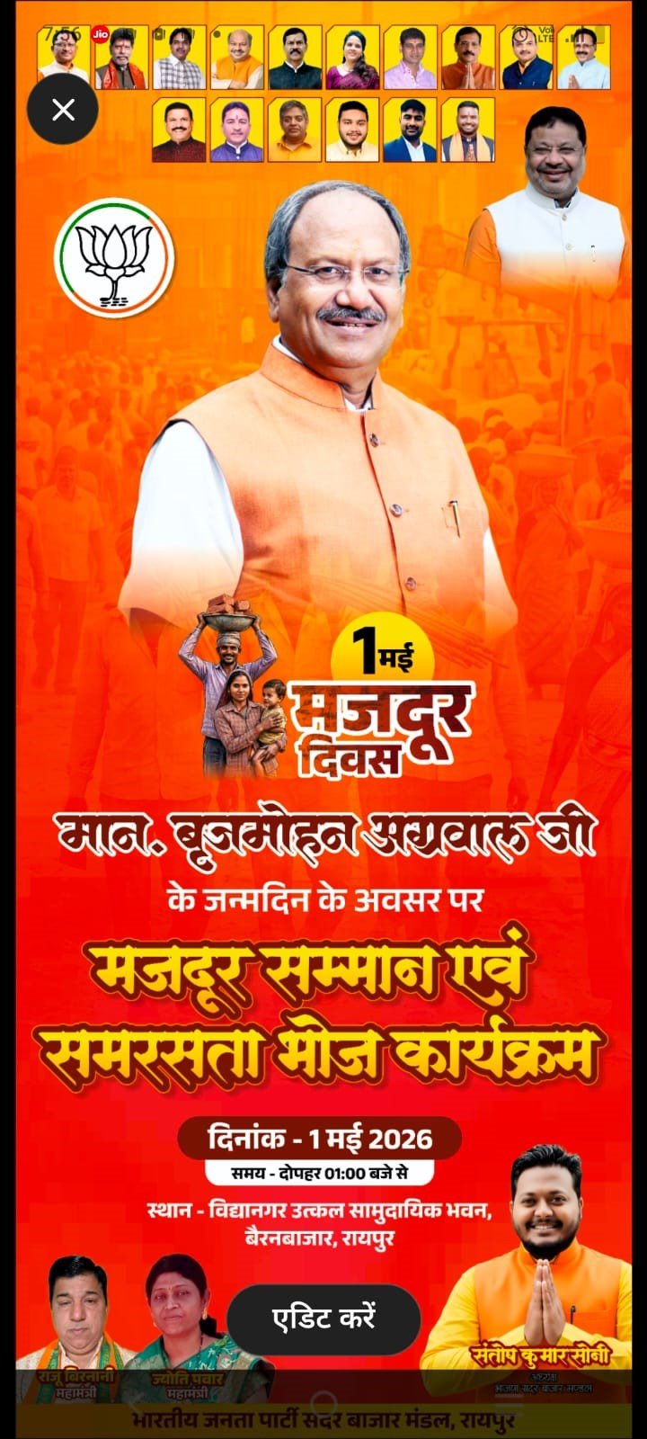 रायपुर। रायपुर लोकसभा के सांसद बृजमोहन अग्रवाल के जन्मदिन पर भाजपा सदर बाजार मंडल ने 1 मई को मजदूर सम्मान एवं समरसता भोज का आयोजन विद्या नगर सामुदायिक भवन, बैरन बाजार में एक बजे किया गया है। यह जानकारी भाजपा सदर बाजार मंडल अध्यक्ष संतोष कुमार सोनी ने दी ।