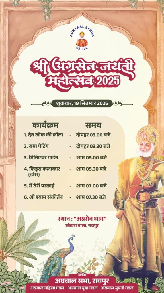रायपुर। अग्रवाल सभा द्वारा आयोजित अग्रसेन जयंती मुख्य कार्यक्रम के द्वितीय दिवस के कार्यक्रम आज अग्रसेन धाम मै सम्पन्न हुए